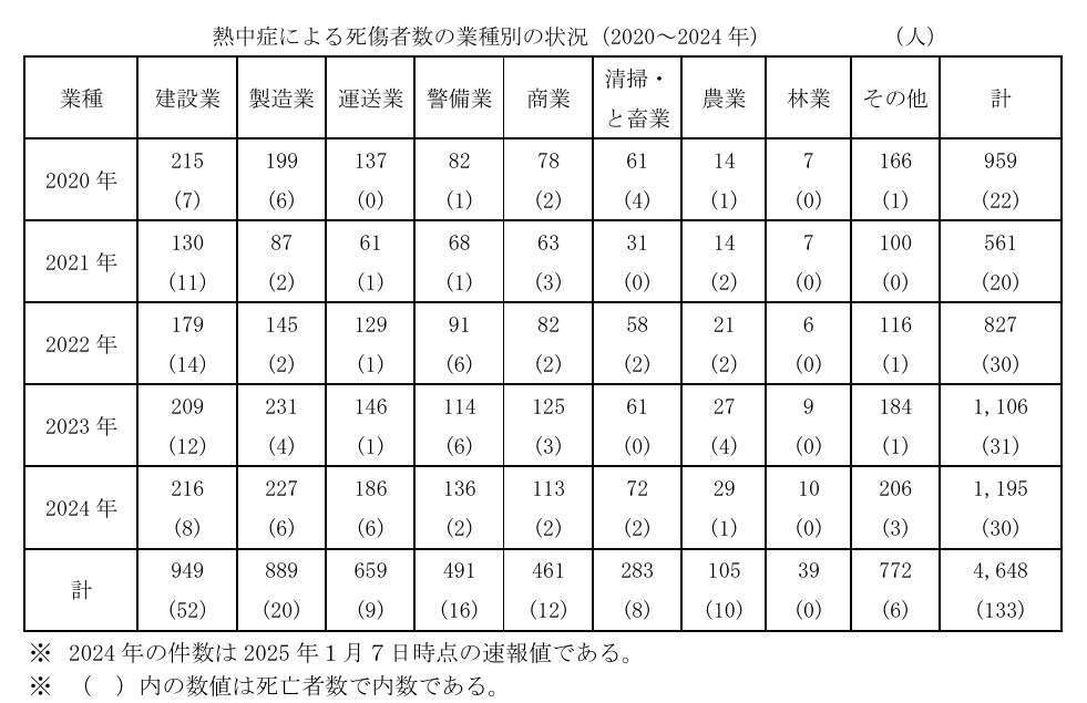 参照:厚生労働省「令和6年 職場における熱中症による死傷災害の発生状況 (令和7年1月7日時点速報値)」より